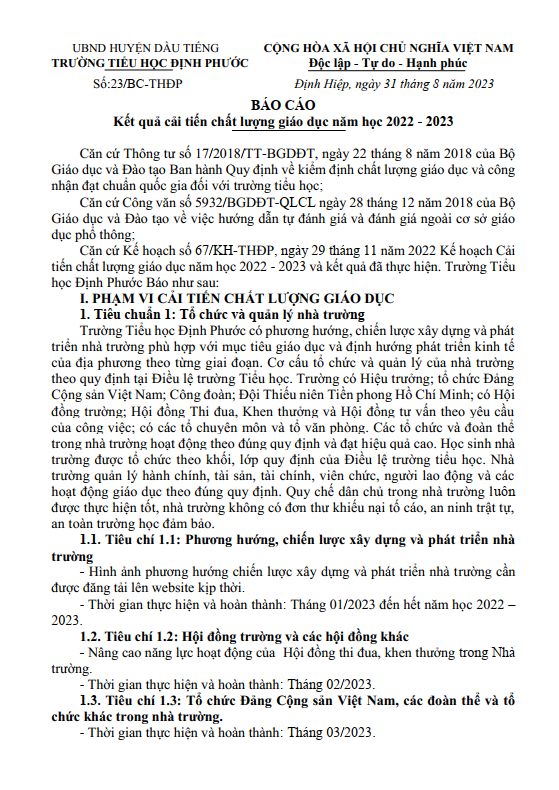 Báo cáo Kết quả cải tiến chất lượng giáo dục năm học 2022-2023