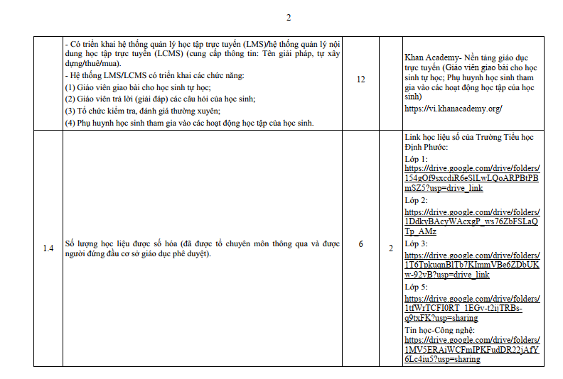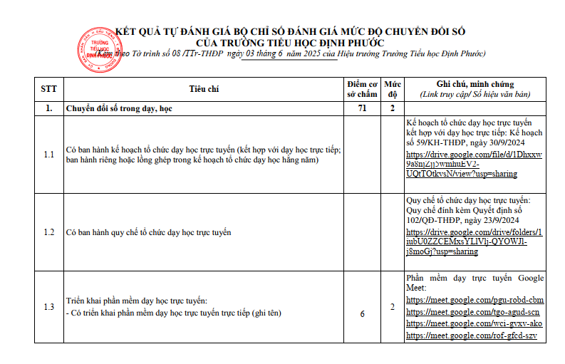 Kết quả tự đánh giá Bộ chỉ số đánh giá mức độ chuyển đổi số của Trường Tiểu học Định Phước