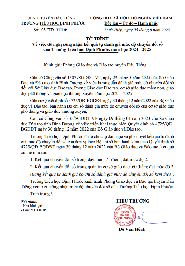 Tờ trình về việc đề nghị công nhận kết quả tự đánh giá mức độ Chuyển đổi số của Trường TH Định Phước, Năm học 2024-2025